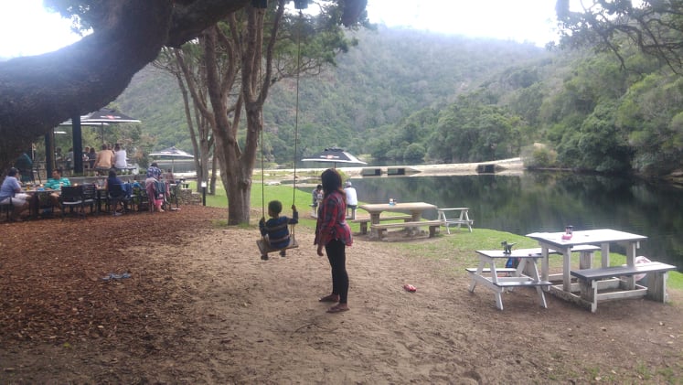 Und nach unserer Runde im Kanu kommt so langsam etwas Hunger auf. Somit geht’s nun in das wenige Kilometer entfernte Restaurant Kaaimans. Dieses Restaurant liegt am Ende des Flusses, den wir soeben im Kanu erkundet haben, kurz bevor der Fluss in den Indischen Ozean mündet. Unser Sohnemann hat hier auch gleich die Schaukeln in den Bäumen entdeckt. Wir setzen und draußen neben dem Fluss an einen Tisch und freuen uns auf unser Dinner. Zu unseren Burgern, Fisch und Wein begleitet uns später noch musikalisch eine Band, so dass wir gut gelaunt den Tag ausklingen lassen. Heute gab es schon einmal Natur pur an der Garden Route.