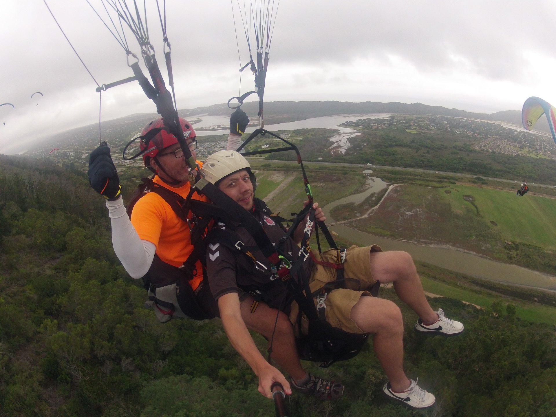 Als etwas Wind aufkommt bereiten wir uns mit ein paar anderen Paraglidern auf unseren Sprung vor. Ab in den Sitz unterm Fallschirm, Helm auf, Kamera an und es kann losgehen. Es ist natürlich ein Tandem-Paraglide, ich fliege also nur bei einem professionellen Paraglider mit. Und für die nächsten knapp 15 Minuten befinden wir uns über Sedgefield, unter uns Wald, Wiesen und Seenplatten. Es ist eine tolle Erfahrung, die ich schon immer mal machen wollte. Und hier an der Garden Route ist die Kulisse hierfür einfach phänomenal.