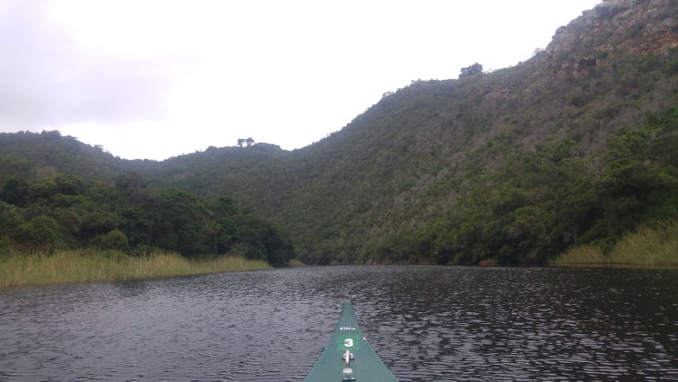 Unterhalb des Gebirges schlängelt sich ein Fluss entlang. Von hier oben können wir Kanus entdecken. Denn diese malerische Gegend kann man auch zu Wasser kennenlernen. Und genau das möchten auch wir machen. Besonders unser Sohnemann freut sich auf diese Tour. Deshalb fahren wir unterhalb des Gebirges in das Wilderness Nature Reserve. Hier kann man nicht nur in Unterkünften übernachten und campen, sondern auch Kanu fahren. Wir schnappen uns also eines dieser Kanus und machen uns zu einem kleinen Ausflug auf. Wir schlängeln uns nun den Fluss entlang, vorbei an Campern und Wanderern und paddeln nun direkt die Map of Africa entlang. Eine herrliche Ruhe umgibt dieser Fluss, ab und zu unterbrochen von Entengeschnatter – Natur pur. Knapp über eine Stunde paddeln wir so gemütlich den Fluss entlang und könnten sicher noch ein paar Stunden dranhängen.