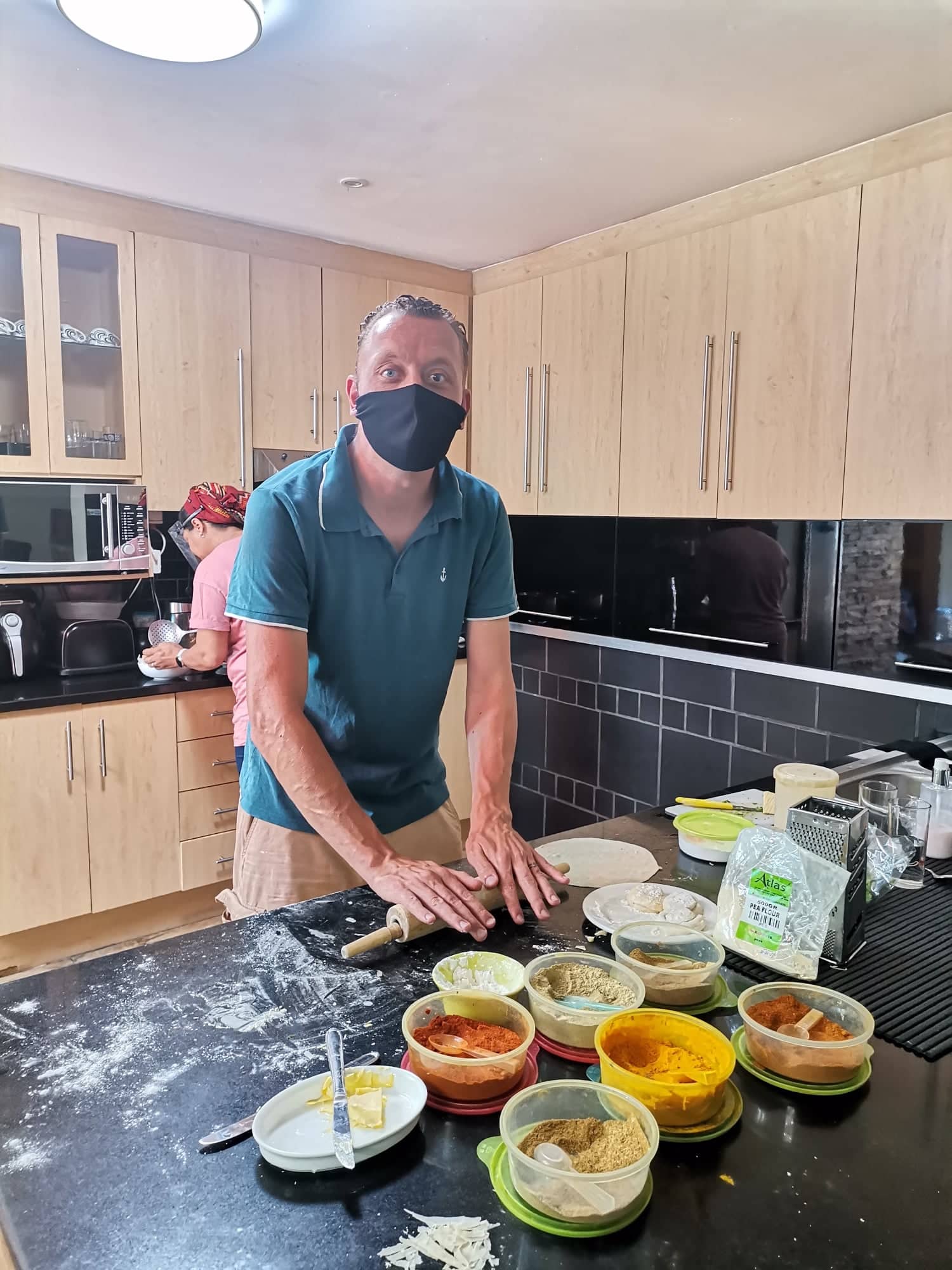 Vor uns stehen schon sechs Schalen mit verschiedenen Gewürzen, an denen wir erst einmal riechen. All diese Gewürze kommen auch gleich mit ein paar Zwiebeln, Kartoffeln und Hähnchen in den Topf. Wir machen uns ein typisches Chicken Curry. Und wer schon einmal Kapmalayisch gegessen hat, der weiß bestimmt auch, wie man dieses Curry hier meist isst – in einem Roti. Rotis sind dünne Fladenbrote, ähnlich wie türkische Lachmacuns. Den Teig für die Rotis machen wir natürlich selbst, rollen ihn geduldig so lange mit der Teigrolle, bis er groß und dünn genug ist. Mit etwas Öl kommen die Rotis dann in die Pfanne.